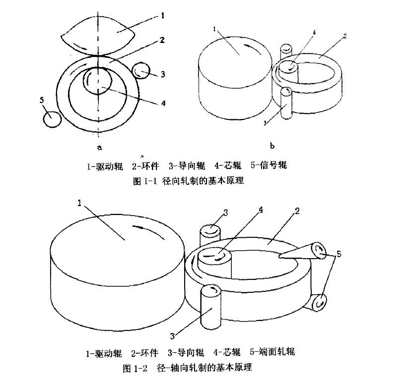 軸承環(huán)軋制成形分為徑向軋制和徑軸向軋制兩種,技術(shù)原理如下圖所示,它利用軋輥的旋轉(zhuǎn)驅(qū)動(dòng)和直線(xiàn)進(jìn)給作用使環(huán)件毛坯連續(xù)咬入軋制孔型,產(chǎn)生壁厚減薄、直徑增大、截面輪廓成形的連續(xù)局部塑性變形,進(jìn)而直接獲得復(fù)雜截面輪廓形狀軸承環(huán)產(chǎn)品的塑性成形新技術(shù)。它具有省力、節(jié)能、節(jié)材、效率高、成本低、產(chǎn)品性能好等顯著特點(diǎn),SKF、FAG、NSK、KOYO、TIMKEN 等國(guó)際著名軸承公司廣泛使用軋環(huán)成形技術(shù)特別是室溫冷軋環(huán)技術(shù)制造高性能軸承環(huán)組件。本文簡(jiǎn)要闡述軸承輾環(huán)機(jī)軋制成形理論、工藝、裝備等研究進(jìn)展和生產(chǎn)應(yīng)用。