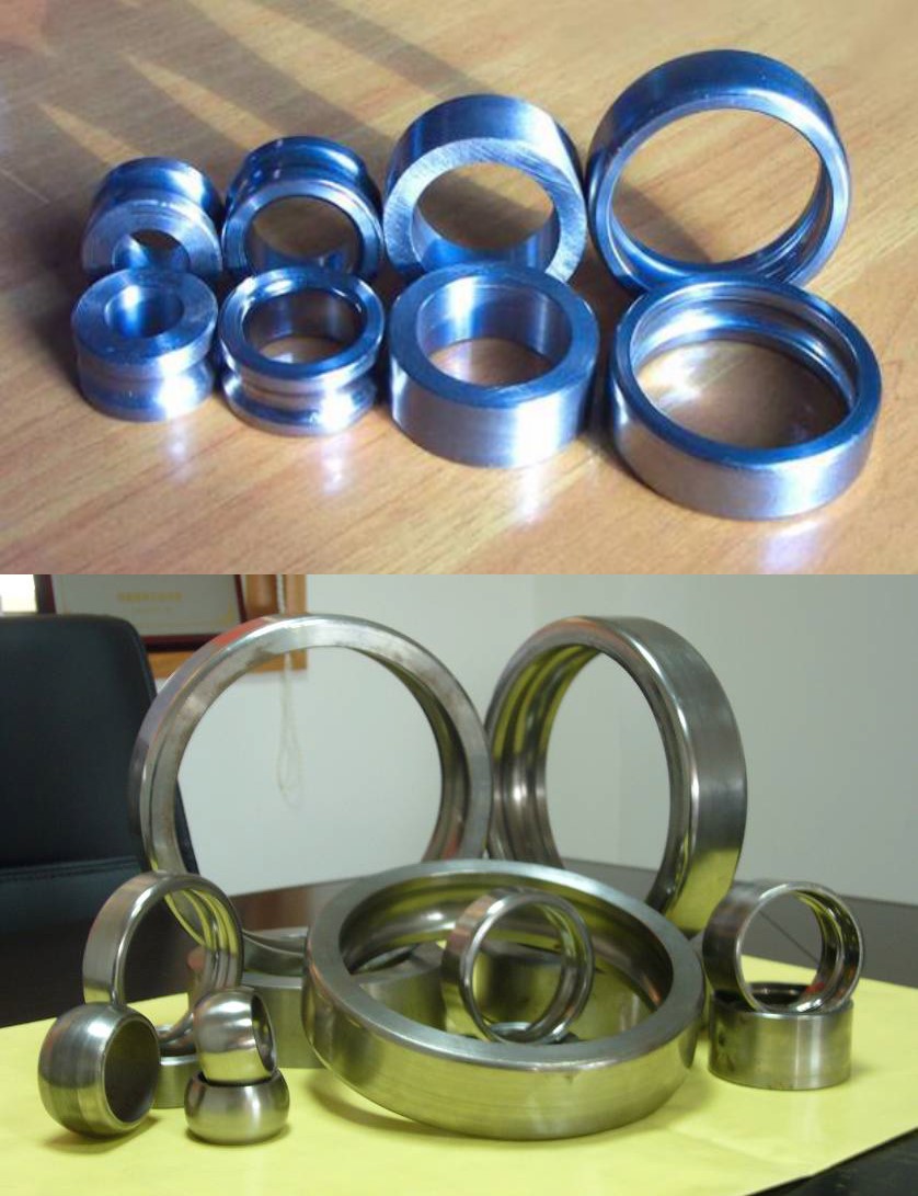 GCr15 軸承鋼含碳量為 1.0%,屬于高碳鋼,塑性差,變形抗力大,難以冷軋環(huán)成形。GCr15 軸承鋼室溫冷軋成形是國(guó)際高性能軸承環(huán)先進(jìn)制造技術(shù)發(fā)展方向,我國(guó)經(jīng)過(guò)深入研究開(kāi)發(fā),發(fā)明了球軸承環(huán)精密冷軋成形方法和滾子軸承環(huán)冷軋成形方法,攻克了 GCr15 軸承鋼室溫冷軋高塑性預(yù)處理、長(zhǎng)壽命軋輥孔型設(shè)計(jì)制造、精密冷軋環(huán)過(guò)程控制等關(guān)鍵技術(shù),突破了高碳軸承鋼冷軋成形的技術(shù)禁區(qū)。精密冷軋直接成形軸承滾道,精度為 6~7 級(jí),高出國(guó)際先進(jìn)水平 1~2 級(jí)。精密冷軋軸承環(huán),節(jié)省了大量切削加工,節(jié)材 15%~20%,滾道內(nèi)部組織細(xì)密,金屬流線(xiàn)分布合理,顯著提高軸承壽命。此外,自主研發(fā)了新型數(shù)控精密冷軋環(huán)機(jī),創(chuàng)新性地研究設(shè)計(jì)了伺服電動(dòng)機(jī)-減速器-強(qiáng)力滾珠絲杠機(jī)構(gòu),取代液壓伺服系統(tǒng)作為冷軋環(huán)機(jī)主傳力進(jìn)給系統(tǒng),解決了爬行和零飄問(wèn)題,保持了機(jī)電伺服進(jìn)給系統(tǒng)精密進(jìn)給優(yōu)點(diǎn),實(shí)現(xiàn)了 50 t 重載塑性變形條件下的軸承環(huán)冷軋精密進(jìn)給,進(jìn)給精度達(dá)到 0.005 mm,加工精度達(dá)到φ 100 mm±0.05 mm,高于德國(guó)和日本同類(lèi)型精密冷軋環(huán)機(jī)加工精度φ 100 mm±0.1 mm。應(yīng)用精密冷軋技術(shù)和裝備批量生產(chǎn)的軸承環(huán)不僅替代進(jìn)口,還大量出口瑞典 SKF、德國(guó) FAG、日本 NSK、美國(guó) TIMKEN 等國(guó)際著名軸承公司,實(shí)現(xiàn)了軸承環(huán)制造從熱鍛低性能粗坯到冷軋高性能精坯的重大技術(shù)突破。精密冷軋成形的典型軸承環(huán)如下圖 所示。